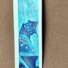 Marque page au motif de fonds marins avec raies manta aux dimension 5,5*20cm, fait main, à l’aquarelle, avec une touche d’aquarelle irisée pour une note de merveilleux 😉
